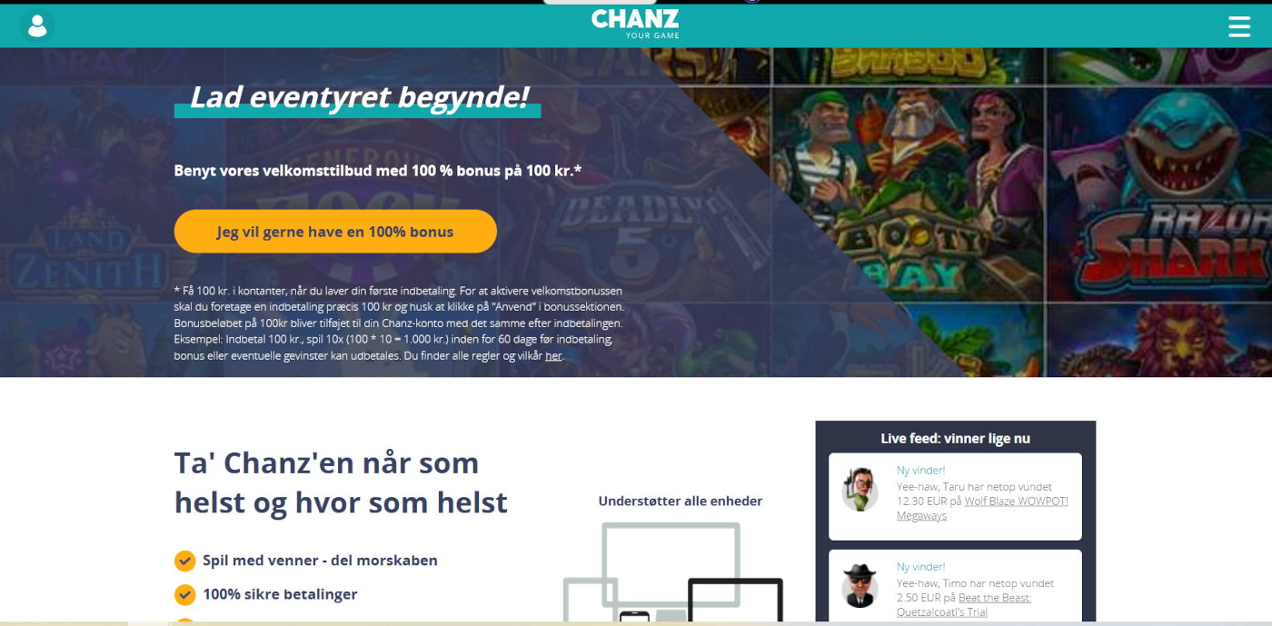 Chanz Casino velkomstbonus: Få 100 kr. ekstra til din spilleoplevelse