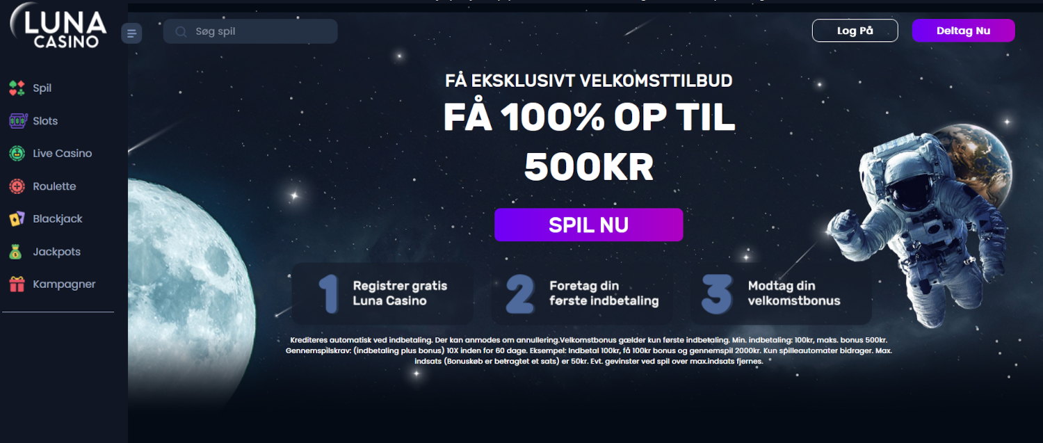 Træd ind i Luna Casinos fascinerende univers, hvor spilleoplevelsen når nye højder med en attraktiv velkomstbonus på 100% op til 500 kr. Dette relativt nye online casino på det danske marked har hurtigt etableret sig som et spændende valg for danske spillere, der søger kvalitetsunderholdning og gode bonusmuligheder. Luna Casino, drevet af den erfarne operatør Skill On Net Limited, tilbyder et imponerende udvalg af over 1800 forskellige spil, der spænder fra farverige spilleautomater til autentiske live casino oplevelser. I denne artikel dykker vi ned i alt, hvad du behøver at vide om Luna Casino velkomstbonussen, og hvordan du får mest muligt ud af dit første besøg på dette lovende online casino.